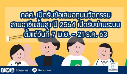 ทุนดีดี กสศ. เปิดรับข้อเสนอทุนนวัตกรรมสายอาชีพชั้นสูง ปี 2564 เปิดรับผ่านระบบตั้งแต่วันที่ 7 พ.ย. – 21 ธ.ค. 63 EZ Webmaster December 1, 2020 กองทุนเพื่อความเสมอภาคทางการศึกษา (กสศ.) เชิญชวนวิทยาลัย/สถานศึกษาอาชีวศึกษา มหาวิทยาลัยเทคโนโลยีราชมงคล วิทยาลัยชุมชน และสถานศึกษาอื่นๆ ที่เปิดสอนระดับประกาศนียบัตรวิชาชีพชั้นสูง/อนุปริญญา/ประกาศนียบัตรผู้ช่วยพยาบาลทุกสังกัด ร่วมยกระดับคุณภาพการเรียนรู้สายอาชีพให้แก่เยาวชนที่มีศักยภาพแต่ขาดแคลนทุนทรัพย์และด้อยโอกาส โดยยื่นข้อเสนอโครงการเพื่อรับทุนนวัตกรรมสายอาชีพชั้นสูง โดยสถานศึกษาที่ผ่านการคัดเลือก จะได้รับทุนสำหรับพัฒนาสถานศึกษา และทุนการศึกษาแก่นักศึกษาจำนวนประมาณ 2,500 ทุน พร้อมกิจกรรมยกระดับคุณภาพการเรียนการสอนให้สามารถผลิตกำลังคนที่สร้างความเข้มแข็งให้กับภาคการผลิตและภาคธุรกิจ…