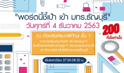 Blogนักเรียน ชี้เป้าเข้าป้าย! มทร.ธัญบุรีจัดโครงการอบรม “พอร์ตนี้ชี้เป้า เข้า มทร.ธัญบุรี” สมัคร 200 คนแรกรับอาหาร เครื่องดื่มฟรี tui sakrapee November 25, 2020 สำนักส่งเสริมวิชาการและงานทะเบียน มหาวิทยาลัยเทคโนโลยีราชมงคลธัญบุรี จัดโครงการอบรม “พอร์ตนี้ชี้เป้า เข้า มทร.ธัญบุรี” ในวันศุกร์ที่ 4 ธันวาคม 2563 ตั้งแต่เวลา 7.30 น. เป็นต้นไป ณ ห้องสงค์ธนาพิทักษ์…