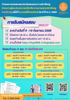 คุรุสภาเปิดรับสมัครทดสอบสมรรถนะวิชาชีพครู ครั้งที่ 2/2568 EZ Webmaster September 9, 2025 “คุรุสภาเปิดรับสมัครการเข้ารับการทดสอบและประเมินสมรรถนะทางวิชาชีพครู ด้านความรู้และประสบการณ์วิชาชีพ ตามมาตรฐานวิชาชีพครู รายวิชาครู ครั้งที่ 2 ระบบอิเล็กทรอนิกส์ ประจำปี พ.ศ. 2568” ระหว่างวันที่ 9 – 19 กันยายน 2568 ตั้งแต่เวลา 08.30 น. เป็นต้นไป แบบทดสอบทั้ง “ภาษาไทย” และ “ภาษาอังกฤษ” สิ้นสุดการรับสมัครวันที่ 19 กันยายน 2568 เวลา 16.30 น. สามารถตรวจสอบสิทธิ และยื่นคำร้องขอมีสิทธิ ระหว่างวันที่ 5 – 11 กันยายน 2568 เข้าสมัครผ่านระบบออนไลน์ ที่นี่ https://ksp2568-2.thaijobjob.com … Continue Reading