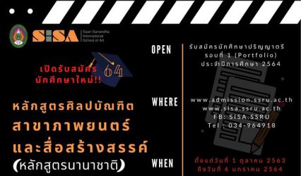 นักเรียนครู-อาจารย์ SISA เปิดรับสมัครสอบคัดเลือกเข้าศึกษาระดับปริญญาตรี ปีการศึกษา 2564 รอบที่ 1 EZ Webmaster November 13, 2020 SISA เปิดรับสมัครสอบคัดเลือกเข้าศึกษาระดับปริญญาตรี ปีการศึกษา 2564 รอบที่ 1 (การรับด้วย Portfolio) หลักสูตรศิลปบัณฑิต สาขาศิลปะภาพยนตร์และสื่อสร้างสรรค์ (หลักสูตรนานาชาติ) รับสมัครตั้งแต่วันที่ 1 ต.ค. 63-6 ม.ค.…