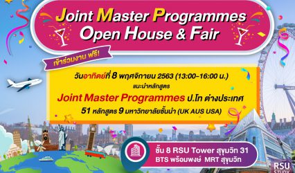นักศึกษาครู-อาจารย์ RSU Study Abroad จัดแนะนำหลักสูตรปริญญาโทต่างประเทศ ฟรี EZ Webmaster October 29, 2020 RSU Study Abroad วิทยาลัยนานาชาติ มหาวิทยาลัยรังสิต จัดกิจกรรมแนะนำหลักสูตรศึกษาต่อปริญญาโทต่างประเทศ ในโครงการ Joint Master Programmes ปริญญาโทต่างประเทศ 51 หลักสูตร จาก 9 มหาวิทยาลัยชั้นนำจากอังกฤษ สกอตแลนด์ อเมริกา และออสเตรเลีย ในวันอาทิตย์ที่ 8 พฤศจิกายน 2563 เวลา 13:00-16:00 น. ณ RSU Study Abroad, ชั้น 8…