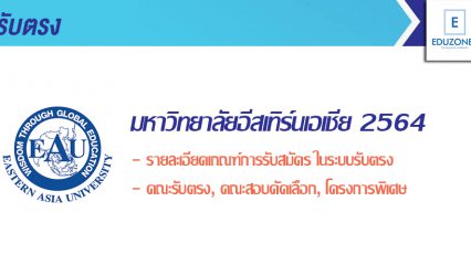 นักเรียนนักศึกษา #รับตรง64 ม.อีสเทิร์นเอเชีย เปิดรับสมัครนศ.ป.ตรี ประจำปีการศึกษา 2564 ถึง 30 ธ.ค.นี้ EZ Webmaster October 19, 2020 มหาวิทยาลัยอีสเทิร์นเอเชีย เปิดรับสมัครบุคคลเพื่อเข้าศึกษาต่อในระดับปริญญาตรี ประจำปีการศึกษา 2564 ตั้งแต่วันนี้ – 30 ธันวาคม 2564 โดยเปิดรับทั้ง 3 รอบ ดังนี้ -คณะรับตรง -คณะสอบคัดเลือก -โครงการพิเศษ…
