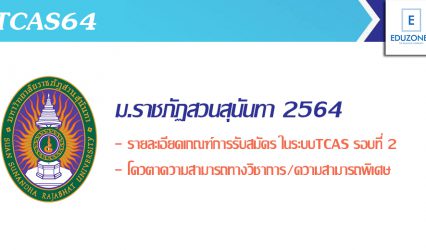 นักเรียนนักศึกษา #TCAS64 ม.ราชภัฏสวนสุนันทา เปิดรับสมัครนศ.ป.ตรี รอบโควตาความสามารถทางวิชาการ/ความสามารถพิเศษ ตั้งแต่วันที่ 1 ก.พ. – 20 เม.ย. 64 EZ Webmaster October 6, 2020 มหาวิทยาลัยราชภัฏสวนสุนันทา เปิดรับสมัครคัดเลือกบุคคลเพื่อเข้าศึกษาต่อระดับปริญญาตรี ภาคปกติ TCAS64 รอบที่ 2 โควตาความสามารถทางวิชาการ/ความสามารถพิเศษ ประจำปีการศึกษา 2564 โดยจะเปิดรับสมัครตั้งแต่วันที่ 1 กุมภาพันธ์ – 20 เมษายน 2564…