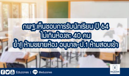 นักเรียน กพฐ.เห็นชอบการรับนักเรียน ปี 64 ไม่เกินห้องละ 40 คน ย้ำ! ห้ามขยายห้อง อนุบาล-ป.1 ห้ามสอบเข้า EZ Webmaster September 20, 2020 ที่ประชุม กพฐ.เห็นชอบการรับนักเรียน ปีการศึกษา 2564 จำกัดจำนวนรับไม่เกินห้องละ 40 คน พร้อมเน้นย้ำห้ามขยายจำนวนห้องและจำนวนนักเรียนต่อห้อง โดยชั้นอนุบาล และ ป.1 ไม่มีการสอบเข้าทุกกรณี โดยเตรียมเสนอ รมว.ศธ.พิจารณาต่อไป เมื่อวันที่…
