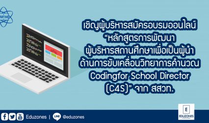 ครู-อาจารย์ เชิญชวนผู้บริหารสมัครอบรมออนไลน์ “หลักสูตรการพัฒนาผู้บริหารสถานศึกษาเพื่อเป็นผู้นำด้านการขับเคลื่อนวิทยาการคำนวณ Codingfor School Director (C4S)” จาก สสวท. EZ Webmaster September 8, 2020 ขอเชิญผู้บริหารสถานศึกษาสมัครเข้าร่วมอบรมออนไลน์ “หลักสูตรการพัฒนาผู้บริหารสถานศึกษาเพื่อเป็นผู้นำด้านการขับเคลื่อนวิทยาการคำนวณ Codingfor School Director (C4S)” จากสถาบันส่งเสริมการสอนวิทยาศาสตร์และเทคโนโลยี (สสวท.) โดยหลักสูตรดังกล่าวมีวัตถุประสงค์เพื่อให้ผู้เข้ารับการอบรมมีความรู้ ความเข้าใจ เกี่ยวกับวัตถุประสงค์ มาตรฐานการเรียนรู้ กลุ่มสาระการเรียนรู้วิทยาศาสตร์และคณิตศาสตร์ การบริหารจัดการหลักสูตรแกนกลางการศึกษาขั้นพื้นฐาน พุทธศักราช 2551…
