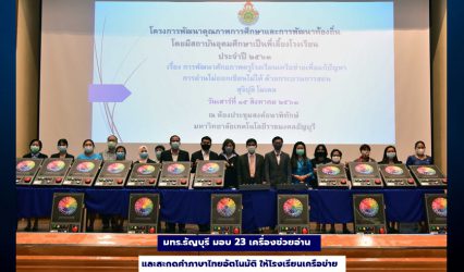 Blogกิจกรรม มทร.ธัญบุรี มอบ 23 เครื่องช่วยอ่านและสะกดคำภาษาไทยอัตโนมัติ ให้โรงเรียนเครือข่าย tui sakrapee August 15, 2020 เมื่อวันที่ 15 สิงหาคม 2563 รองศาสตราจารย์ ไพบูลย์ แย้มเผื่อน ที่ปรึกษามหาวิทยาลัยเทคโนโลยีราชมงคล (มทร.ธัญบุรี) มอบสื่อ “ชุดอาดุยอิโน่ทัชเกมการอ่านคำภาษาไทย” ให้กับโรงเรียนเครือข่าย 23 โรงเรียน กิจกรรมพัฒนาครูกลุ่มสาระการเรียนรู้ภาษาไทย…