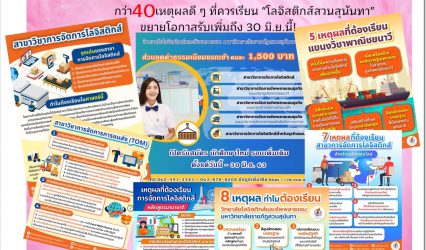Blogนักเรียน กว่า40เหตุผลดี ๆ ที่ควรเรียน “โลจิสติกส์สวนสุนันทา” ขยายโอกาสรับเพิ่มถึง 30 มิ.ย.นี้! tui sakrapee June 23, 2020 เรียนโลจิสติกส์และซัพพลายเชนในยุคนี้ดีอย่างไร คำตอบที่ได้คือ … เรามีมากกว่า 40 เหตุผลดี ๆ ที่ต้องยอมรับความจริงที่ว่าสาขาอาชีพนี้คือชีวิตที่จะทำให้เราอยู่รอดก้าวไปสู่ความสำเร็จได้โดยง่าย ยิ่งถ้าได้เข้ามาอยู่ในสถาบันที่มีคุณภาพระดับชั้นนำอันดับ 1 ของประเทศก็เหมือนเสือติดปีกใครก็ฉุดไม่อยู่ มีอาชีพที่สนองตอบต่อความต้องการของโลกรออยู่มากมาย เหตุผลที่ดี ๆ เช่นนี้ไม่ใช่ว่าจะยกมาแอบอ้าง พูดเองเออเองเอาง่าย…