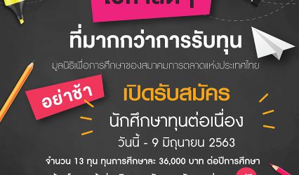 ทุนดีดีนักศึกษา มูลนิธิเพื่อการศึกษาของสมาคมการตลาดแห่งประเทศไทย เปิดรับสมัครนักศึกษาทุนฯ EZ Webmaster May 28, 2020 มูลนิธิเพื่อการศึกษาของสมาคมการตลาดแห่งประเทศไทย ตระหนักถึงความสำคัญด้านการศึกษา พร้อมส่งเสริมนักศึกษาภาควิชาการตลาดที่มีความมุ่งมั่น ตั้งใจ โดยพร้อมให้การสนับสนุนทุนการศึกษาต่อเนื่อง เพื่อให้นิสิตนักศึกษาที่ได้รับการคัดเลือก ได้จบการศึกษาเป็นบัณฑิตคุณภาพ เป็นอนาคตของแวดวงนักการตลาดไทย ทางมูลนิธิฯ จึงเปิดรับสมัคร นักศึกษาทุนต่อเนื่อง ประจำปี 2563 จำนวน 13 ทุน โดยจะให้การสนับสนุนการศึกษา จำนวน…