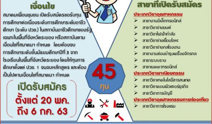 ทุนดีดีนักเรียน สมาคมเพื่อนชุมชน เปิดรับสมัครทุนอาชีวะ ตั้งแต่วันนี้ – 6 กรกฎาคม 63 EZ Webmaster May 28, 2020 สมาคมเพื่อนชุมชน เปิดรับสมัครขอรับทุนการศึกษาต่อเนื่องในหลักสูตรอาชีวศึกษา ระดับประกาศนียบัตรวิชาชีพ (ปวช.) ในสถาบันการศึกษาของรัฐ ในโครงการ “ทุนอาชีวศึกษาเพื่อนชุมชน ประจำปี 2563” เพื่อเพิ่มโอกาสทางการศึกษาให้แก่เยาวชนจังหวัดระยองได้ศึกษาต่อในสายอาชีพ ตลอดจนรองรับความต้องการตลาดแรงงานในเขตพื้นที่อีอีซีในอนาคต โดยผู้สมัครจะต้องจบการศึกษาระดับมัธยมศึกษาปีที่ 3 จากโรงเรียนในจังหวัดระยอง และมีผลการเรียนเฉลี่ยสะสม ไม่ต่ำกว่า 2.70 เปิดรับสมัคร ตั้งแต่วันนี้ – 6 กรกฎาคม 2563 นี้ ผู้ที่สนใจสามารถสอบถามข้อมูลเพิ่มเติมได้ที่…