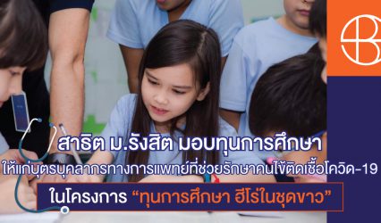 ทุนดีดีนักเรียน สาธิต ม.รังสิต มอบทุนการศึกษาให้แก่บุตรบุคลากรทางการแพทย์ที่ช่วยรักษาคนไข้ติดเชื้อโควิด-19 ในโครงการ “ทุนการศึกษา ฮีโร่ในชุดขาว” EZ Webmaster April 28, 2020 โรงเรียนสาธิตแห่งมหาวิทยาลัยรังสิต มอบทุนการศึกษาให้แก่บุตรของบุคลากรทางการแพทย์ที่ปฏิบัติงานช่วยรักษาคนไข้ที่ติดเชื้อไวรัสโคโรนา 19 (Covid-19) จนสำเร็จการศึกษา และขอมอบรอยยิ้มกลับมาให้แก่ครอบครัวท่านอีกครั้ง ในโครงการ “ทุนการศึกษา ฮีโร่ในชุดขาว” ดร.อภิระมณ อุไรรัตน์ ประธานเจ้าหน้าที่บริหารโรงเรียนสาธิตแห่งมหาวิทยาลัยรังสิต และโรงเรียนสาธิตนานาชาติทวิภาษาแห่งมหาวิทยาลัยรังสิต เชียงใหม่ กล่าวว่า ด้วยวิกฤตสถานการณ์โควิด19…