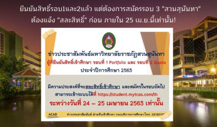 Blog ยืนยันสิทธิ์รอบ1และ2แล้ว แต่ต้องการสมัครรอบ 3 “สวนสุนันทา” ต้องแจ้ง “สละสิทธิ์”ภายใน 25 เม.ย.นี้เท่านั้น! tui sakrapee April 24, 2020 cแจ้งถึงนักเรียนที่ได้ยืนยันสิทธิ์เข้าศึกษา รอบที่ 1 Portfolio และ รอบที่ 2 Quota ประจำปีการศึกษา 2563 แต่ต้องการ “สละสิทธิ์” ให้เข้าไปยืนยันในระบบถึงวันที่ 25 เมษายนนี้ หลังจากนั้นสามารถสมัครรอบที่…