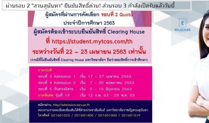 Blogนักเรียน ผ่านรอบ 2 “สวนสุนันทา” ยืนยันสิทธิ์ด่วน! ส่วนรอบ 3 กำลังเปิดรับแล้ววันนี้ tui sakrapee April 21, 2020 ผ่านรอบ 2 สวนสุนันทา ยืนยันสิทธิ์ด่วน! ผู้สมัครที่ผ่านการคัดเลือก รอบที่ 2 Quota ประจำปีการศึกษา 2563 #ผู้สมัครต้องเข้าระบบยืนยันสิทธิ์ Clearing House ที่ https://student.mytcas.com/th ระหว่างวันที่ 22 –…
