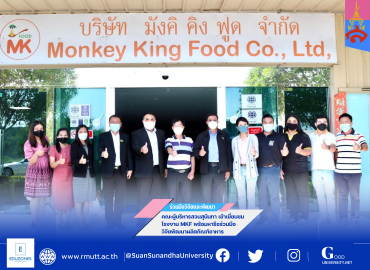 คณะผู้บริหารสวนสุนันทาเยี่ยมชมโรงงาน MKF ร่วมมือวิจัยพัฒนาผลิตภัณฑ์อาหาร tui sakrapee December 20, 2021 รศ.ดร.ชุติกาญจน์ ศรีวิบูลย์ อธิการบดีมหาวิทยาลัยราชภัฏสวนสุนันทา มอบหมายให้ ผศ.ดร.คมสัน โสมณวัตร รองอธิการบดีวิทยาเขตนครปฐม และรศ.ดร.สมเดช รุ่งศรีสวัสดิ์ คณบดีวิทยาลัยสหเวชศาสตร์ และคณะ เยี่ยมศึกษาดูงานโรงงาน Monkey King Food (MKF) โดยมี ดร.เทพรักษ์ เหลืองสุวรรณ ประธานบริษัท Namyong Group กรรมการส่งเสริมกิจการมหาวิทยาลัยราชภัฏสวนสุนันทา และ Mr.Wang Kang Ping, Managing Director, MKF ให้การต้อนรับอย่างดียิ่ง บริษัท มังคิ คิง ฟูด จำกัด เป็นโรงงานอุตสาหกรรมอาหารแปรรูป เชี่ยวชาญด้านการผลิตอาหารเพื่อคนรักสุขภาพผลิตภัณฑ์อาหารที่โดดเด่น และมีศักยภาพการส่งออก ได้แก่ บุก ตรา… Continue Reading