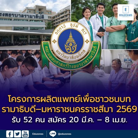 EZ Webmaster March 9, 2026 โครงการผลิตแพทย์เพื่อชาวชนบท รามาธิบดี–มหาราชนครราชสีมา ปี 2569 รับ 52 คน EZ Webmaster March 9, 2026 โครงการผลิตแพทย์เพื่อชาวชนบท รามาธิบดี–มหาราชนครราชสีมา ปี 2569 รับ 52 คน สมัคร 20 มี.ค. – 8 เม.ย. คณะแพทยศาสตร์โรงพยาบาลรามาธิบดี มหาวิทยาลัยมหิดล ร่วมกับ โรงพยาบาลมหาราชนครราชสีมา เปิดรับสมัครนักเรียนเข้าศึกษาใน หลักสูตรแพทยศาสตรบัณฑิต โครงการผลิตแพทย์เพื่อชาวชนบท ประจำปีการศึกษา 2569 เพื่อผลิตแพทย์ที่มีความรู้ความสามารถและกลับไปพัฒนาระบบสาธารณสุขในภูมิภาค โครงการดังกล่าวมุ่งเน้นการเปิดโอกาสให้นักเรียนในพื้นที่ต่างจังหวัด โดยเฉพาะภาคตะวันออกเฉียงเหนือ ได้มีโอกาสเข้าศึกษาแพทยศาสตร์ และกลับไปปฏิบัติงานในพื้นที่บ้านเกิดเพื่อลดความเหลื่อมล้ำด้านการเข้าถึงบริการสาธารณสุข ระยะเวลาการรับสมัคร 📌 รับสมัคร: 20 มีนาคม… Continue Reading
