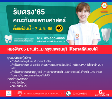 มทร.ธัญบุรี รวมใจ แปรธงชาติไทยผืนใหญ่ที่สุด ส่งพลังใจถึงรั้วของชาติ หลังสถานการณ์ชายแดนยืดเยื้อ tui sakrapeeDecember 24, 2025 มหาวิทยาลัยเทคโนโลยีราชมงคลธัญบุรี จัดกิจกรรมแสดงพลังความรักชาติครั้งสำคัญผ่านการแปรผืนผ้าธงชาติไทยขนาดใหญ่ที่สุด พร้อมพิธีสดุดีและยืนสงบนิ่งเพื่อรำลึกถึงความเสียสละของทหารไทย ณ ลานอนันต์รังสรรค์ มทร.ธัญบุรี ในช่วงเย็นวันอังคารที่ 23 ธันวาคม 2568 รศ.ดร.สมหมาย ผิวสอาด อธิการบดีมหาวิทยาลัยเทคโนโลยีราชมงคลธัญบุรี (มทร.ธัญบุรี) เปิดเผยว่าทางมหาวิทยาลัยจัดกิจกรรม ราชมงคลธัญบุรี ส่งกำลังใจ ถึงทหารไทยผู้กล้า… คณะศึกษาศาสตร์ ม.ศิลปากร ผนึกกำลังชุมชน จัดโครงการ “1 ภาควิชา 1 ชุมชน” เชิดชูอัตลักษณ์พระปฐมเจดีย์ สู่เมืองแห่งการเรียนรู้ที่ยั่งยืน EZ WebmasterDecember 22, 2025 คณะศึกษาศาสตร์ ม.ศิลปากร ผนึกกำลังชุมชน จัดโครงการ “1 ภาควิชา 1 ชุมชน” เชิดชูอัตลักษณ์พระปฐมเจดีย์ สู่เมืองแห่งการเรียนรู้ที่ยั่งยืน เมื่อวันเสาร์ที่ 20 ธันวาคม 2568 คณะศึกษาศาสตร์ มหาวิทยาลัยศิลปากร จัดโครงการ… สวนสุนันทาเปิดเวที HIDA รุ่นที่ 5 รวมแพทย์ผู้เชี่ยวชาญถ่ายทอดความรู้ “โรคใกล้ตัว” ชี้แนวทางดูแลตนเอง ลดเสี่ยงโรคเรื้อรังคนไทย tui sakrapeeDecember 19, 2025 📰 ราชภัฏสวนสุนันทาเปิดเวที HIDA รุ่นที่ 5 รวมแพทย์ผู้เชี่ยวชาญถ่ายทอดความรู้ “โรคใกล้ตัว” ชี้แนวทางดูแลตนเอง ลดเสี่ยงโรคเรื้อรังคนไทย เมื่อวันพฤหัสบดีที่ 18 ธันวาคม 2568 ณ โรงแรมชาเทรียม ริเวอร์ไซด์ กรุงเทพฯหลักสูตรผู้บริหารระดับสูงด้านการพัฒนาคุณภาพบริการสุขภาพและความงาม (HIDA)… มหาวิทยาลัยกรุงเทพ จัดงาน “BU Game On! Expo x Job Fair for Game Industry 2025” เวทีพิสูจน์ฝีมือนักพัฒนาเกมรุ่นใหม่ tui sakrapeeDecember 18, 2025 มหาวิทยาลัยกรุงเทพ จัดงาน “BU Game On! Expo x Job Fair for Game Industry 2025″ เวทีพิสูจน์ฝีมือนักพัฒนาเกมรุ่นใหม่ เชื่อมโลกการศึกษาสู่อุตสาหกรรมจริง มหาวิทยาลัยกรุงเทพ จัดงาน… Search for: Search Classic Blog หมอฟัน’65มาแล้ว ม.กรุงเทพธนบุรี รับจำกัด 40 ที่นั่ง เรียนหลักสูตรทันตแพทยศาสตรบัณฑิต tui sakrapee November 17, 2021 คณะทันตแพทยศาสตร์ มหาวิทยาลัยกรุงเทพธนบุรี เปิดรับสมัครบุคคลเข้าศึกษาในหลักสูตรทันตแพทยศาสตรบัณฑิต ปีการศึกษา 2565 จำนวน 40 ที่นั่ง เริ่มแล้ววันนี้ การรับสมัคร ตั้งแต่วันนี้ – 7 ม.ค. 65 จำนวนการรับสมัคร รับนักศึกษาจํากัด 40 ที่นั่งเท่านั้น คุณสมบัติ – เป็นผู้สําเร็จการศึกษาระดับชั้น ม.6 หรือเทียบเท่า สายวิทย์-คณิต เกรดเฉลี่ยสะสม ไม่ต่ำกว่า 2.75 – เป็นผู้สําเร็จการศึกษาปริญญาตรี (สายวิทยาศาสตร์) ผลการเรียนไม่ต่ำกว่า 2.50 กำหนดการ 16 ม.ค.2565 สอบข้อเขียน, สอบสัมภาษณ์ ณ อาคารคลินิกทันตกรรม 21 ม.ค.… Continue Reading ม.หอการค้าไทย จับมื