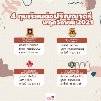EZ Webmaster November 14, 2021 4 ทุนเรียนต่อระดับปริญญาตรี อัปเดตเดือนพฤศจิกายน ปี 2021 EZ Webmaster November 14, 2021 สำหรับน้องๆ ที่กำลังศึกษาอยู่ระดับชั้นมัธยมศึกษาปีที่ 6 หรือผู้ที่กำลังสนใจอยากไปศึกษาต่อต่างประเทศในระดับปริญญาตรี วันนี้เราได้รวมทุนไปเรียนต่อต่างประเทศในระดับปริญญาตรี อัปเดตเดือนกันยายน ปี 2021 มาฝากกันค่ะ 1.ทุน University of Waikato University of Waikato GEMS Scholarships for International Students in New Zealand, 2022 เป็นทุนการศึกษาในระดับปริญญาตรี ประเทศนิวซีแลนด์ มูลค่าสูงสุด NZD$10,000 ที่จะใช้สำหรับเป็นส่วนลดค่าเรียน โดยสามารถสมัครได้ถึงวันที่… Continue Reading