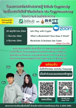 มทร.ธัญบุรี ร่วมกับ Bitkub Academy จัดอบรมให้ความรู้เรื่อง Cryptocurrency ฟรี tui sakrapee November 2, 2021 ขอเชิญนักศึกษา บุคลากรและผู้ที่สนใจ สมัครเข้าร่วมอบรมโครงการเสริมสร้างความรู้ Bitkub Cryptonity ในเรื่องเทคโนโลยี Blockchain และ Cryptocurrency ในวันที่ 29 พ.ย. และวันที่ 1, 3 ธ.ค. เวลา 17.00 – 18.45น. ลงทะเบียนและรายละเอียดโครงการ https://www.rmutt.ac.th/content/52038 Continue Reading