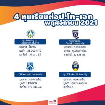 4 ทุนเรียนต่อระดับปริญญาตรี-โท เดือนพฤศจิกายน ปี 2021 EZ Webmaster October 31, 2021 สำหรับผู้ที่สนใจอยากไปศึกษาต่อในระดับปริญญาตรีและปริญญาโทที่ต่างประเทศ วันนี้เราได้รวบรวมทุนศึกษาต่อต่างประเทศในระดับปริญญาตรีและปริญญาโท อัปเดตเดือนพฤศจิกายน ปี 2021 มาฝากกันค่ะ 1.ทุน Ministry of Education Huaya Ministry of Education Huaya Enrichment international awards in Taiwan เป็นทุนในระดับปริญญาตรีและโท ที่ไต้หวัน โดยทุนเนี้จะให้เป็นเงินเดือน ๆ ละ 25,000 NTD ตลอดโปรแกรม หมดเขตรับสมัครถึงวันที่ 31 ธันวาคม 2021 รายละเอียดคลิก >>> http://th.interscholarship.com/somkiat2013/4638 2.ทุน Charles Darwin University CDU (Charles… Continue Reading