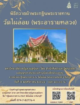 tui sakrapee October 15, 2021 สวนสุนันทา ขอเชิญร่วมทำบุญใหญ่ “ถวายผ้าพระกฐินพระราชทาน ปี 64” tui sakrapee October 15, 2021 มหาวิทยาลัยราชภัฏสวนสุนันทา ได้รับพระมหากรุณาธิคุณโปรดเกล้าฯ พระราชทานผ้าพระกฐินให้นำไปถวายพระสงฆ์จำพรรษา ณ พระอารามหลวงต่างๆ เป็นประจำทุกปี ซึ่งในปีนี้จะมีกำหนดนำผ้าพระกฐินพระราชทานไปถวาย ณ วัดไผ่ล้อม (พระอารามหลวง) จ.จันทบุรี ในวันศุกร์ที่ ๕ พฤศจิกายน ๒๕๖๔ จึงขอเชิญชวนบุคลากร นิสิตนักศึกษา นักเรียน นิสิตเก่า และประชาชนผู้มีจิตศรัทธาร่วมทำบุญถวายผ้าพระกฐินพระราชทานโดยเสด็จพระราชกุศลตามกำลังทรัพย์และศรัทธา ได้ที่ ธนาคาร กรุงเทพฯ สาขา มหาวิทยาลัยราชภัฏสวนสุนันทา ชื่อ “กฐินพระราชทาน 2564 วัดไผ่ล้อม จ.จันทบุรี” เลขที่บัญชี 074-7-82776-4… Continue Reading
