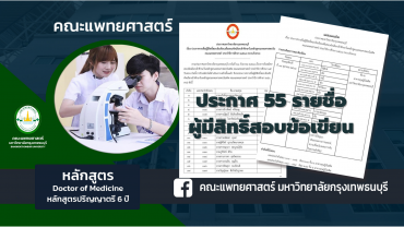 tui sakrapee October 12, 2021 แพทยศาสตร์ ม.กรุงเทพธนบุรี ประกาศ 55 รายชื่อผู้มีสิทธิ์สอบข้อเขียน 14 -15 ต.ค.64 tui sakrapee October 12, 2021 แพทยศาสตร์ ม.กรุงเทพธนบุรี ประกาศ 55 รายชื่อผู้มีสิทธิ์สอบข้อเขียน สอบตรงแพทย์ ในวันที่ 14 และวันที่ 15 ตุลาคม 2564 มหาวิทยาลัยกรุงเทพธนบุรี ประกาศรายชื่อผู้มีสิทธิ์สอบข้อเขียน เพื่อสอบคัดเลือกเข้าศึกษาในหลักสูตรแพทยศาสตรบัณฑิต คณะแพทยศาสตร์ ประจําปีการศึกษา ๒๕๖๔ (ระบบรับตรง) ผู้ที่มีรายชื่อดังกล่าวตรวจสอบรายละเอียด วัน-เวลา ทำการสอบให้เรียบร้อย และปฏิบัติตามประกาศมหาวิทยาลัยอย่างเคร่งครัด ตามมาตรการป้องกันการแพร่ระบาดของโรคโควิด-19 ผู้ที่มีสิทธิ์ข้อเขียนทุกท่านต้องแสดงใบรับรองผลการตรวจ ATK ต่อเจ้าหน้าที่คุมสอบในวันสอบ เอกสารตามประกาศมหาวิทยาลัยที่ประกาศไปแล้วนั้น หากมีข้อสงสัย สามารถสอบถามผ่านทางเพจเฟจบุ๊คคณะฯ https://www.facebook.com/MdBtuOfficial/ … Continue Reading