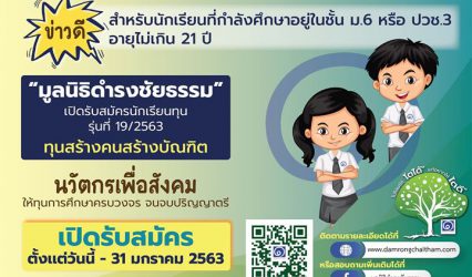ทุนดีดีนักเรียน มูลนิธิดำรงชัยธรรม เปิดรับสมัครทุนการศึกษาระดับปริญญาตรี ทุนสร้างคน สร้างบัณฑิต “นวัตกรเพื่อสังคม” EZ Webmaster December 16, 2019 มูลนิธิดำรงชัยธรรม เปิดรับสมัครทุนการศึกษาระดับปริญญาตรี (ทุนต่อเนื่อง แบบครบวงจร) จำนวน 20 ทุน ในโครงการทุนสร้างคน สร้างบัณฑิต “นวัตกรเพื่อสังคม” รุ่นที่ 19/2563 เปิดรับสมัครตั้งแต่วันนี้ – 31 มกราคม…