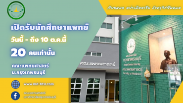 tui sakrapee October 4, 2021 โค้งสุดท้าย! คณะแพทยศาสตร์ มหาวิทยาลัยกรุงเทพธนบุรี เปิดรับสมัครนักศึกษา เริ่มวันนี้ – 10 ต.ค. 2564 tui sakrapee October 4, 2021 คณะแพทยศาสตร์ มหาวิทยาลัยกรุงเทพธนบุรี ได้ผ่านการรับหลักสูตรแพทยศาสตร์บัณฑิต จากแพทยสภาอย่างเป็นทางการพร้อมเปิดรับสมัครนักศึกษาแล้ว เริ่มรับสมัครตั้งแต่วันนี้ – 10 ต.ค. 2564 สอบข้อเขียน 14 – 15 ต.ค. 2564 สอบสัมภาษณ์ 21 ต.ค. 2564 ตรวจสุขภาพร่างกาย จิตใจ 22 ต.ค. 2564 รายงานตัว และลงทะเบียน 28 ต.ค. 2564 เปิดภาคการศึกษาที่ 1 ปีการศึกษา… Continue Reading