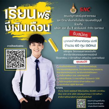 สาขาวิศวกรรมเมคคาทรอนิกส์ มทร.ธัญบุรี เปิดให้ 60 ทุน เรียนฟรีมีเงินเดือน จบบรรจุงาน tui sakrapee October 2, 2021 คณะครุศาสตร์อุตสาหกรรม มหาวิทยาลัยเทคโนโลยีราชมงคลธัญบุรีร่วมกับ บริษัท เอส เอ็น ซี ฟอร์มเมอร์ จํากัด (มหาชน)รับสมัครบุคคลเข้าศึกษาต่อทุน ป.ตรี จํานวน 60 ทุน (60คน) หลักสูตร วิศวกรรมศาสตรบัณฑิต สาขาวิชาวิศวกรรมเมคคาทรอนิกส์ ใช้เวลาเรียน 2 ปีการศึกษา (เทียบโอน ผลการเรียน) คุณสมบัติ -ต้องเป็นนักศึกษาจาก วิทยาลัยเทคนิคมีนบุรี, วิทยาลัยเทคนิคสมุทรสาคร, วิทยาลัยเทคนิคสมุทรสงคราม, วิทยาลัยเทคนิคปทุมธานี, สถาบันเทคโนโลยีจิตรลดา -สําเร็จการศึกษา ปวส. เมคคาทรอนิกส์ -เกรดเฉลี่ยสะสม 3 ภาคการศึกษา ไม่น้อยกว่า 3.00 -ไม่มีภาระผูกผันทางทหาร (ผ่านการเรียน รด.) -สอบข้อเขียน ปฏิบัติ… Continue Reading