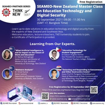 EZ Webmaster September 21, 2021 สัมมนาออนไลน์ ฟรี “เทคโนโลยีการศึกษาและความปลอดภัยทางดิจิทัล” EZ Webmaster September 21, 2021 หน่วยงานการศึกษานิวซีแลนด์ (Education New Zealand; ENZ) ร่วมกับ สํานักงานเลขาธิการองค์การรัฐมนตรีศึกษาแห่งเอเชียตะวันออกเฉียงใต้ (Southeast Asian Ministers of Education Organization Secretariat : SEAMEO Secretariat) ขอเชิญผู้อำนวยการสถานศึกษา นักการศึกษา นักวิจัย คุณครู อาจารย์จากสถาบันและมหาวิทยาลัยต่างๆ เข้าร่วมงานสัมมนาออนไลน์ ฟรี SEAMEO-New Zealand Master Class ในหัวข้อ “Education Technology and Digital Security” เพื่อนำเสนอข้อมูลโซลูชั่นที่ทันสมัยทางด้านเทคโนโลยีการศึกษาและความปลอดภัยทางดิจิทัลจากวิทยากรผู้เชี่ยวชาญจากประเทศนิวซีแลนด์และเอเชียตะวันออกเฉียงใต้ โดยจัดขึ้นผ่านการถ่ายทอดสด ในวันที่ 30 กันยายน 2564 เวลา 09.00-11.00 น.… Continue Reading