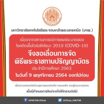 EZ Webmaster September 20, 2021 มจพ. ประกาศเลื่อนการจัดพิธีพระราชทานปริญญาบัตร ประจำปีการศึกษา 2563 EZ Webmaster September 20, 2021 มหาวิทยาลัยเทคโนโลยีพระจอมเกล้าพระนครเหนือ (มจพ.) ประกาศเลื่อนการจัดพิธีพระราชทานปริญญาบัตร ประจำปีการศึกษา 2563 สืบเนื่องจากสถานการณ์การแพร่ระบาดของโรคติดเชื้อไวรัสโคโรนา 2019 (COVID-19) จึงขอเลื่อนการจัดพิธีพระราชทานปริญญาบัตร ประจำปีการศึกษา 2563 ในวันที่ 9 พฤศจิกายน 2564 ออกไปก่อน จนกว่าจะมีกำหนดการใหม่แจ้งให้ทราบต่อไป ทั้งนี้ ยังสามารถติดตามข่าวสารประชาสัมพันธ์ของ มจพ. ได้ทุกช่องจากเว็บไซต์ เฟซบุ๊ก หรือ กลุ่มงานประชาสัมพันธ์ มจพ. โทรศัพท์ 0-2555-2000 ต่อ 1121, 1166, 1175 Continue Reading