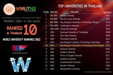 มจพ. TOP 10 ม.ไทย จากการจัดอันดับ THE Ranking 2022 EZ Webmaster September 20, 2021 มหาวิทยาลัยเทคโนโลยีพระจอมเกล้าพระนครเหนือ (มจพ.) ติดอันดับ TOP 10 มหาวิทยาลัยไทย จากการจัดอันดับมหาวิทยาลัยชั้นนำของโลก Times Higher Education World University Rankings 2022 กลับมาติดอับดับอย่างสมศักดิ์ศรีอีกครั้ง สืบเนื่องจากปี 2563 มจพ. ถูกจัดอันดับที่ 13 โดยคิดคะแนนจากผลคะแนนดิบ ซึ่งปีนี้มีมหาวิทยาลัยไทยติดอับดับรวม 17 มหาวิทยาลัย Times Higher Education หรือ THE สถาบันจัดอันดับมหาวิทยาลัยโลก ชื่อดังจากประเทศอังกฤษ ได้เผยแพร่ผลการจัดอันดับ Times Higher Education World University Rankings 2022 โดยมหาวิทยาลัยเทคโนโลยีพระจอมเกล้าพระนครเหนือ เป็นอันดับที่ 6… Continue Reading