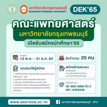 คณะแพทยศาสตร์ ม.กรุงเทพธนบุรี เปิดรับจำกัด 20 ที่นั่งเท่านั้น เริ่มวันนี้ถึง 31 ธ.ค.64 tui sakrapee November 13, 2021 ข่าวดี!! ถึงน้องๆ #DEK65 ที่มีความฝันอยากเป็นหมอ คณะแพทยศาสตร์ มหาวิทยาลัยกรุงเทพธนบุรีของเรา ได้ผ่านการรับรองหลักสูตรแพทยศาสตรบัณฑิต จากแพทยสภาอย่างเป็นทางการแล้ว เปิดรับสมัครนักศึกษาแล้ว!! ตั้งแต่ 12 พ.ย. – 31 ธ.ค. 2564 จำนวน 20 คน สอบข้อเขียน 8 – 9 ม.ค. 2565 สอบสัมภาษณ์ 14, 18 ม.ค. 2565 ตรวจสุขภาพร่างกาย จิตใจ 17 ม.ค. 2565 รายงานตัว และลงทะเบียนเรียน 1 ก.พ. 2565 เปิดภาคการศึกษาที่ 1… Continue Reading