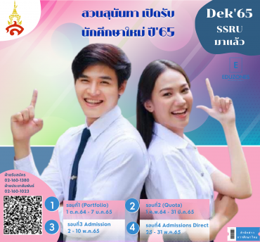 tui sakrapee September 3, 2021 Dek’65 “สวนสุนันทา” มาแล้ว เปิดรับนักศึกษาใหม่ ภาคปกติ เริ่มเปิดระบบรอบที่ 1 (Portfolio) 1 ต.ค.นี้ tui sakrapee September 3, 2021 มหาวิทยาลัยราชภัฏสวนสุนันทา เปิดรับสมัครนักศึกษาใหม่ ภาคปกติ ระดับปริญญาตรี ประจำปีการศึกษา 2565 ดูรายละเอียดได้ที่เว็บไซต์ https://admission.ssru.ac.th/ เปิดรับสมัครแต่วันที่ 1 ตุลาคม 2564 เป็นต้นไป ข้อมูลการรับสมัคร รอบที่1 (Portfolio) สมัครตั้งแต่วันที่ 1 ตุลาคม 2564 – 7 มกราคม 2565 รอบที่2 (Quota) สมัครตั้งแต่วันที่ 1 กุมภาพันธ์ 2564 – 31… Continue Reading
