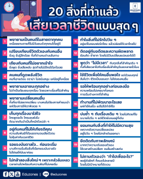20 สิ่งที่ทำแล้วเสียเวลาชีวิตแบบสุด ๆ EZ Webmaster July 22, 2025 1. พยายามเป็นคนดีในสายตาทุกคนเหนื่อยแทบตายก็ไม่มีวันชนะใจทุกคนได้อยู่ดี2. เปรียบเทียบชีวิตตัวเองกับคนอื่นยิ่งดู ยิ่งรู้สึกด้อย ทั้งที่ต่างคนต่างเส้นทาง3. เถียงกับคนที่ไม่อยากเข้าใจยิ่งพูด ยิ่งเสียพลัง สุดท้ายไม่มีใครได้อะไรเลย4. คบคนที่ดูดพลังชีวิตคนที่เอาแต่บ่น ดราม่า ไม่สนับสนุน แค่มีอยู่ก็เหนื่อย5. พยายามเอาชนะทุกอย่างไม่จำเป็นต้องชนะทุกเรื่อง โดยเฉพาะเรื่องที่ไม่สำคัญ6. พยายามเปลี่ยนคนอื่นทั้งที่เขาไม่อยากเปลี่ยนบางคนไม่ต้องการคำแนะนำ แค่ต้องการให้เราฟังเฉย ๆ7. เก็บทุกเรื่องมาใส่ใจใครพูดอะไร ใครมองยังไง คิดมากเกินจำเป็นก็หนักใจเปล่า ๆ8. อยู่กับคนที่ไม่ให้เกียรติคุณความสัมพันธ์ที่ต้องอดทนจนเสียตัวตน ไม่คุ้มค่ากับเวลาชีวิต9. รอแรงบันดาลใจ… ก่อนจะเริ่มบางทีการเริ่มคือสิ่งที่เรียกแรงบันดาลใจ ไม่ใช่รอให้มันมาก่อน10. ไม่กล้าลองสิ่งใหม่ ๆ เพราะกลัวล้มเหลวเวลาผ่านไปพร้อมกับความฝันที่ไม่เคยเริ่ม11. ทำในสิ่งที่ไม่รักไปวัน ๆ เพราะกลัวเปลี่ยนอยู่แต่ในคอมฟอร์ตโซน แล้วปล่อยให้เวลาไหลไป12. ติดอยู่กับอดีตและความผิดพลาดย้อนคิด ซ้ำซาก โดยไม่มีวันเปลี่ยนแปลงอะไรได้13. พูดว่า “ไม่มีเวลา” กับทุกสิ่งที่สำคัญจริง ๆทั้งที่เสียเวลาไปกับเรื่องไม่สำคัญวันละหลายชั่วโมง14. ใช้ชีวิตเพื่อให้คนอื่นพอใจ แต่ตัวเองทุกข์ลืมไปว่า… Continue Reading