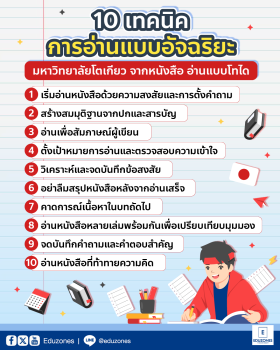 10 เทคนิคการอ่านแบบอัจฉริยะ มหาวิทยาลัยโตเกียว จากหนังสือ อ่านแบบโทได EZ Webmaster July 22, 2025 10 ข้อคิดที่ได้จากหนังสืออ่านแบบโทได 1. เริ่มอ่านหนังสือด้วยความสงสัยและการตั้งคำถาม การอ่านหนังสือไม่ใช่แค่การรับข้อมูลเข้ามา แต่คือการท้าทายความคิดของผู้เขียนผ่านคำถาม เช่น ทำไมผู้เขียนถึงเลือกเขียนแบบนี้? สิ่งนี้มีความจริงหรือไม่? คำถามเหล่านี้จะช่วยให้เราตรวจสอบข้อมูลและฝึกความคิดให้เฉียบคมขึ้น การตั้งคำถามยังทำให้เราได้เห็นหลายมิติของเนื้อหาที่บางครั้งอาจไม่ชัดเจนในครั้งแรกที่อ่าน 2. สร้างสมมุติฐานจากปกและสารบัญ ก่อนที่เราจะเริ่มอ่านหนังสือ ควรอ่านชื่อหนังสือ ข้อมูลบนปก และสารบัญเพื่อคาดการณ์เนื้อหา การทำเช่นนี้เป็นการสร้างสมมุติฐานที่ช่วยให้เราเตรียมพร้อมในการทำความเข้าใจกับเนื้อหามากขึ้น เมื่อสมมุติฐานนี้ได้รับการยืนยันหรือท้าทายระหว่างอ่าน เราสามารถปรับเปลี่ยนวิธีการอ่านเพื่อให้สอดคล้องกับความต้องการในการเรียนรู้ของเรา 3. อ่านเพื่อสัมภาษณ์ผู้เขียน การอ่านควรเป็นมากกว่าการฟังเนื้อหาที่ถ่ายทอด แต่ควรอ่านเหมือนนักข่าวที่กำลังสัมภาษณ์ผู้เขียน ตั้งคำถามและจดบันทึกคำตอบที่เราได้รับจากเนื้อหา โดยพิจารณาว่าผู้เขียนต้องการสื่ออะไรและเราควรตั้งข้อสังเกตตรงไหน การอ่านแบบนี้ช่วยให้เราเข้าใจเนื้อหาลึกซึ้งและเป็นการพัฒนาทักษะการวิเคราะห์ไปพร้อมกัน 4. ตั้งเป้าหมายการอ่านและตรวจสอบความเข้าใจ เป้าหมายในการอ่านคือสิ่งสำคัญที่ต้องกำหนดล่วงหน้า เพื่อให้เรารู้ว่าทำไมเราจึงเลือกอ่านหนังสือเล่มนี้ และสารบัญจะช่วยให้เราทราบว่าเราจะได้อะไรจากแต่ละบท การอ่านด้วยเป้าหมายที่ชัดเจนจะช่วยให้เรารู้ว่าเราเข้าใจเนื้อหาเพียงใด หากพบว่ามีข้อผิดพลาดในความเข้าใจ เรายังสามารถกลับมาปรับเปลี่ยนวิธีการอ่านได้เสมอ 5. วิเคราะห์และจดบันทึกข้อสงสัย การตั้งข้อสงสัยต่างจากการตั้งคำถามตรงที่ข้อสงสัยมักไม่มีคำตอบที่ชัดเจนในหนังสือ การสงสัยในสิ่งที่เราอ่าน เช่น ความจริงของข้อมูล เป็นการฝึกทักษะการคิดอย่างเป็นระบบ… Continue Reading