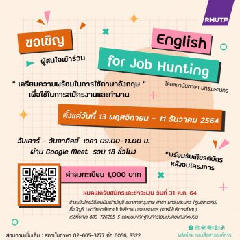 EZ Webmaster October 12, 2021 มทร.พระนคร จัดอบรม English for Job Hunting เตรียมความพร้อมการใช้ภาษาอังกฤษ เพื่อสมัครและทำงาน EZ Webmaster October 12, 2021 สถาบันภาษา มหาวิทยาลัยเทคโนโลยีราชมงคลพระนคร ขอเชิญผู้สนใจเข้าร่วมอบรมโครงการ English for Job Hunting เตรียมความพร้อมในการใช้ภาษาอังกฤษ เพื่อใช้ในการสมัครงานและทำงาน เรียนระหว่างวันที่ 13 พฤศจิกายน – 11 ธันวาคม 2564 09.00-11.00 น. (ทุกวันเสาร์และวันอาทิตย์ ทั้งหมด 18 ชั่วโมง) เวลา ผ่าน Google Meet พร้อมรับเกียรติบัตรหลังจบโครงการ ผู้สนใจชำระค่าลงทะเบียน 1,000 บาท ที่บัญชีมหาวิทยาลัยเทคโนโลยีราชมงคลพระนคร (การให้บริการสังคม)… Continue Reading