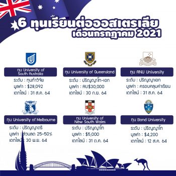 6 ทุนเรียนต่อประเทศออสเตรเลีย อัพเดทเดือนกรกฎาคม 2021 EZ Webmaster July 27, 2021 ประเทศออสเตรเลีย เป็นหนึ่งในประเทศที่มีนักเรียนักศึกษาเดินทางไปเรียนต่อค่อนข้างสูง เพราะเป็นประเทศที่เหมาะกับการฝึกภาษา มีหลักสูตรการเรียนที่หลากหลาย ค่าครองชีพที่ไม่สูงจนเกินไป และยังมีทุนสำหรับการไปเรียนต่อที่หลากหลายอีกด้วย วันนี้เราจึงรวบรวมทุนเรียนต่อประเทศออสเตรเลีย อัพเดทเดือนกรกฎาคม ปี 2021 มาฝากกันค่ะ 1.ทุน University of South Australia ทุน UniSA University President’s Scholarships (UPS) for International Students in Australia, 2021 ของ University of South Australia เปิดให้ทุนสำหรับการทำงานวิจัย โดยครอบคลุมค่าศึกษาวิจัย ประกันสุขภาพและค่าครองชีพ ไม่น้อยกว่า $28,092 per annum โดยจะเปิดรับสมัครถึงวันที่… Continue Reading