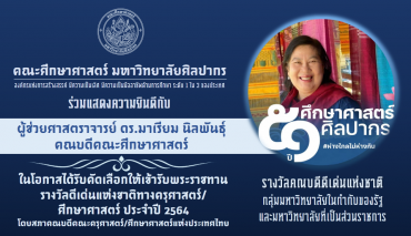 ม.ศิลปากร ร่วมยินดี “ผศ.ดร.มาเรียม นิลพันธุ์” รับรางวัล คณบดีดีเด่นแห่งชาติทางครุศาสตร์/ศึกษาศาสตร์ tui sakrapee September 14, 2021 คณะศึกษาศาสตร์ มหาวิทยาลัยศิลปากร ร่วมแสดงความยินดีกับ ผู้ช่วยศาสตราจารย์ ดร.มาเรียม นิลพันธุ์ คณบดีคณะศึกษาศาสตร์ ในโอกาสได้รับคัดเลือกให้เข้ารับพระราชทานรางวัลดีเด่นแห่งชาติทางครุศาสตร์/ศึกษาศาสตร์ ประจำปี 2564 รางวัลคณบดีดีเด่นแห่งชาติ กลุ่มมหาวิทยาลัยในกำกับของรัฐ และมหาวิทยาลัยที่เป็นส่วนราชการ #ปริญญาเอกการจัดการนันทนาการการท่องเที่ยวและกีฬามหาวิทยาลัยศิลปากร #ปเอกการจัดการฯกีฬามหาวิทยาลัยศิลปากร Continue Reading