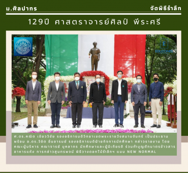 ม.ศิลปากร จัดพิธีรำลึก 129 ปี ศาสตราจารย์ศิลป์ พีระศรี tui sakrapee September 14, 2021 เมื่อวันที่ 14 ก.ย.2564 ณ ลานอนุสาวรีย์ศาสตราจารย์ศิลป์ พีระศรี มหาวิทยาลัยศิลปากร วิทยาเขตพระราชวังสนามจันทร์ จังหวัดนครปฐม มหาวิทยาลัยศิลปากร วิทยาเขตพระราชวังสนามจันทร์ จัดงานวันศาสตราจารย์ศิลป์ พีระศรี ประจำปี 2564 ( New Normal ) เนื่องในโอกาสครบรอบ 129 ปี ศาสตราจารย์ศิลป์ พีระศรี โดยมี ศาสตราจารย์ ดร.คณิต เขียววิชัย รองอธิการบดีพระราชวังสนามจันทร์ เป็นประธานพร้อมด้วย อาจารย์ ดร.วิชิต อิ่มอารมย์ รองอธิการบดีฝ่ายกิจการนักศึกษา กล่าวรายงาน ภายในงานมีการทำบุญตักบาตรข้าวสารอาหารแห้ง การกล่าวสุนทรพจน์ พิธีวางดอกไม้รำลึกฯ โดยประธานในพิธี พร้อมคณะผู้บริหาร คณาจารย์ บุคลากร… Continue Reading