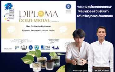 ‘กระถางต้นไม้จากกากกาแฟ’ ผลงานวิจัยสวนสุนันทา คว้าเหรียญทองเวทีวิจัยระดับนานาชาติ tui sakrapee May 26, 2021 ผู้ช่วยศาสตราจารย์นภดล สังวาลเพ็ชร นักวิจัยสาขาวิชาการออกแบบผลิตภัณฑ์สร้างสรรค์ มหาวิทยาลัยราชภัฏสวนสุนันทา และนายอรรถวุฒ คุ้มบ้าน นักศึกษาสาขาวิชาการออกแบบผลิตภัณฑ์สร้างสรรค์ คณะศิลปกรรมศาสตร์ มหาวิทยาลัยราชภัฏสวนสุนันทา ในฐานะผู้ช่วยนักวิจัย คว้ารางวัลเหรียญทอง Gold Medal จากการประกวดสิ่งประดิษฐ์นวัตกรรมนานาชาติ กับผลงานวิจัยเรื่อง ‘กระถางต้นไม้จากกากกาแฟ’ Plant Pot from Coffee Grounds บนเวทีระดับนานาชาติ ในงาน E U R O I N V E N T 13th European Exhibition of Creativity and Innovation 2021 (ONLINE)… Continue Reading