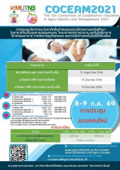 คณะอุตสาหกรรมเกษตร มจพ. ปราจีนบุรี การประชุมวิชาการ “COCEAM 2021” รูปแบบออนไลน์ EZ Webmaster May 15, 2021 คณะอุตสาหกรรมเกษตร มหาวิทยาลัยเทคโนโลยีพระจอมเกล้าพระนครเหนือ วิทยาเขตปราจีนบุรี กำหนดจัดการประชุมวิชาการ The 5th Consortium of Cooperative Education in Agro-Industry and Management 2021 (COCEAM 2021) ระหว่างวันที่ 8-9 กรกฎาคม 2564 ในรูปแบบออนไลน์ เพื่อเป็นเวทีนำเสนอผลงานสหกิจศึกษาด้านอุตสาหกรรมเกษตร วิทยาศาสตร์การอาหาร วิศวกรรมอาหาร การจัดการธุรกิจเกษตร กำหนดการส่งผลงานบทคัดย่อและบทความฉบับเต็ม (Proceeding) ภายในวันที่ 15 มิถุนายน 2564 ค่าลงทะเบียน ประเภท อาจารย์/บุคลากร และผู้นำเสนอผลงาน วันที่ 1 มีนาคม – 15 มิถุนายน… Continue Reading