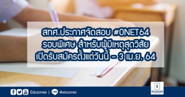 EZ Webmaster March 29, 2021 สทศ.ประกาศจัดสอบ #ONET64 รอบพิเศษ สำหรับผู้มีเหตุสุดวิสัย เปิดรับสมัครตั้งแต่วันนี้ – 3 เม.ย. 64 EZ Webmaster March 29, 2021 สถาบันทดสอบทางการศึกษาแห่งชาติ (องค์การมหาชน) ประกาศจัดสอบรอบพิเศษกรณีเกิดเหตุสุดวิสัยในการทดสอบทางการศึกษาระดับชาติขั้นพื้นฐาน (O-NET) ระดับชั้นมัธยมศึกษาปีที่ 6 ปีการศึกษา 2563 โดยจะเปิดรับสมัครตั้งแต่วันที่ 30 มีนาคม – 3 เมษายน 2564 คุณสมบัติผู้มีสิทธิ์สมัครสอบ O-NET รอบพิเศษ -เป็นนักเรียนที่เหตุสุดวิสัยที่เกิดกับตัวนักเรียน/เกิดจากปัจจัยภายนอกแล้วส่งผลต่อตัวนักเรียน -เป็นนักเรียนชั้นมัธยมศึกษาปีที่ 6 ที่มีเลขที่นั่งสอบและไม่ได้เข้าสอบในวันที่ 28-29 มีนาคม 2564 -เป็นนักเรียนเทียบเท่าชั้นมัธยมศึกษาปีที่ 6 ที่มีเลขที่นั่งสอบและไม่ได้เข้าสอบตามวันและเวลาที่กำหนด -เป็นนักเรียนชั้นมัธยมศึกษาปีที่ 6 ที่โรงเรียนไม่ได้ส่งข้อมูลเข้าสอบ… Continue Reading