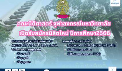 นักศึกษานักเรียน คณะนิติศาสตร์ จุฬาฯ เปิดรับสมัครรอบตรง ปี 2568 ไม่ใช้คะแนนสอบกลาง! EZ Webmaster April 21, 2025 คณะนิติศาสตร์ จุฬาลงกรณ์มหาวิทยาลัย เปิดรับสมัครบุคคลเข้าศึกษาต่อในหลากหลายหลักสูตร ครอบคลุมทั้งระดับปริญญาตรี ภาคนอกเวลาราชการ หลักสูตรนานาชาติ ระดับปริญญาโท และระดับปริญญาเอก สำหรับปีการศึกษา 2568 โดยมีรายละเอียดดังนี้ หลักสูตรจัดการเรียนการสอนเป็นภาษาไทย •หลักสูตร น.บ. (นิติศาสตรบัณฑิต ภาคบัณฑิต…