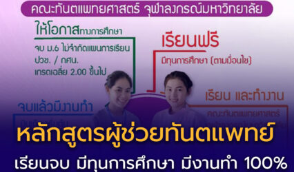 นักเรียน รับสมัครผู้ช่วยทันตแพทย์(หลักสูตร1ปี) คณะทันตแพทยศาสตร์ จุฬาลงกรณ์มหาวิทยาลัย 2568 EZ Webmaster April 21, 2025 เรียนจบ มีทุนการศึกษา มีงานทำ 100% หลักสูตรผู้ช่วยทันตแพทย์ (หลักสูตร1ปี) คณะทันตแพทยศาสตร์ จุฬาลงกรณ์มหาวิทยาลัย คณะทันตแพทยศาสตร์ จุฬาลงกรณ์มหาวิทยาลัย ได้เปิดฝึกอบรมหลักสูตรประกาศนียบัตรผู้ช่วยทันตแพทย์ มาตั้งแต่ปี พ.ศ. 2545 โดยมีวัตถุประสงค์ เพื่อผลิตผู้ช่วยทันตแพทย์ที่มีความรู้และทักษะทางวิชาชีพสำหรับช่วยงานทางทันตกรรม…