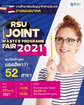 RSU Study Abroad จัดกิจกรรม RSU Joint Master Programs Fair 2021 EZ Webmaster March 8, 2021 RSU Study Abroad วิทยาลัยนานาชาติ มหาวิทยาลัยรังสิต จัดกิจกรรม RSU Joint Master Programs Fair 2021 แนะแนวการศึกษาต่อปริญญาโทต่างประเทศ ฟรีไม่มีค่าใช้จ่าย ในวันเสาร์ที่ 27 มีนาคม 2021 เวลา 13:00 – 16:00 น. ณ ชั้น 8 อาคาร RSU Tower สุขุมวิท 31 (BTS พร้อมพงษ์, MRT สุขุมวิท) ภายในงานพบกับการแนะแนวหลักสูตรปริญญาโทต่างประเทศมากมาย กว่า 52 สาขา เช่น MBA, Marketing, Digital Marketing, International Business, Business Management, Fashion Management,… Continue Reading
