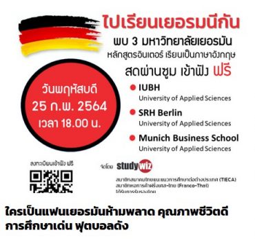 Germany Mini Open Day สดผ่านซูม EZ Webmaster February 19, 2021 ใครเป็นแฟนเยอรมันห้ามพลาด คุณภาพชีวิตดี การศึกษาเด่น ฟุตบอลดัง จบแล้วอยู่ทำงานต่อได้ตามกฎหมาย Germany Mini Open Day สดผ่านซูม พบอาจารย์จาก 3 มหาวิทยาลัยในเมืองยอดนิยมของเยอรมนี IUBH University of Applied Sciences เป็นมหาวิทยาลัยที่สอนทุกหลักสูตรเป็นภาษาอังกฤษ ได้รับการจัดอันดับ 5 FIBAA Premium Seals อันดับต้นๆ ของ CHE ranking สมาชิกก่อตั้งของกลุ่ม Hotel Schools of Distinction ได้รับการรับรองโดย AACSB และได้ QS 5 ดาวสำหรับการเรียนแบบ ออนไลน์ มีทุนหลากหลายรูปแบบ SRH Berlin University of Applied Sciences เรียนทักษะล้ำสมัยจากคณาจารย์ที่เป็นมือโปรสายครีเอทีฟ ในเมืองหลวงของเยอรมนีที่เต็มไปด้วยสีสันและชีวิตชีวา มีโอกาสรับทุนถึง 50% ของค่าเล่าเรียนปีแรก… Continue Reading