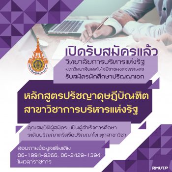 EZ Webmaster February 10, 2021 วิทยาลัยการบริหารแห่งรัฐ มทร.พระนคร เปิดรับสมัคร ปริญญาเอก หลักสูตรการบริหารแห่งรัฐ มุ่งปั้นผู้นำประเทศ EZ Webmaster February 10, 2021 วิทยาลัยการบริหารแห่งรัฐ มหาวิทยาลัยเทคโนโลยีราชมงคลพระนคร เปิดรับสมัครนักศึกษาหลักสูตรปรัชญาดุษฎีบัณฑิต สาขาวิชาการบริหารแห่งรัฐ Ph.D. (State Administration) ครั้งแรกของหลักสูตรการบริหารแห่งรัฐในประเทศไทย ตอบโจทย์ภาวะขาดแคลนผู้นำพร้อมใช้งาน เหมาะสำหรับผู้บริหารระดับกลางถึงสูง ให้มีทักษะในการทำงานวิจัยระดับชาติและนานาชาติ สามารถประกอบอาชีพผู้บริหารระดับสูงในหน่วยงานรัฐและเอกชน หรือเป็นที่ปรึกษาระดับสูงในการแก้ปัญหาให้หน่วยงาน ตลอดจนเป็นอาจารย์ในสถาบันอุดมศึกษา คุณสมบัติผู้สมัคร เป็นผู้สำเร็จการศึกษาระดับปริญญาตรี หรือปริญญาโททุกสาขาวิชา เปิดรับสมัครตั้งแต่บัดนี้เป็นต้นไป เปิดภาคเรียนในเดือนมิถุนายน 2564 (เปิดสอนวิชาพื้นฐานสำหรับผู้ไม่มีพื้นฐานในเดือนเมษายน) เรียนนอกเวลาราชการ ผู้สนใจสอบถามรายละเอียดเพิ่มได้ที่ อาจารย์อิทธิศักดิ์ พลอยศิริชล โทรศัพท์ 061 994 9266 หรือคุณจีรวัสส์ แสนสุภาพ โทรศัพท์… Continue Reading