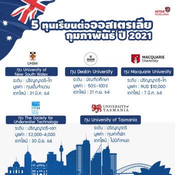 รวม 5 ทุนเรียนต่อออสเตรเลีย กุมภาพันธ์ ปี 2021 EZ Webmaster February 7, 2021 สำหรับผู้ที่สนใจไปศึกษาต่อต่างประเทศนั้น ประเทศออสเตรเลียถือเป็นอีกหนึ่งประเทศที่น่าสนใจเพราะมีหลักสูตรและมหาวิทยาลัยที่มีคุณภาพหลายแหล่ง รวมทั้งยังมีทุนการศึกษาสำหรับการเรียนต่ออีกมากมาย วันนี้เราได้รวบรวมทุนการศึกษาสำหรับการไปเรียนต่อที่ออสเตรเลีย ประจำปีการศึกษา 2021 ที่กำลังเปิดรับสมัครมาฝากกันค่ะ 1.ทุน University of New South Wales UNSW International Scientia Coursework Scholarships เป็นทุนการศึกษาต่อในระดับตรีและโทที่ประเทศออสเตรเลีย ทุนนี้เป็นทุนที่เต็มจำนวนแก่นักศึกษาสำหรับการเรียนหลักสูตรเต็มเวลา โดยจะเปิดรับใบสมัครถึงวันที่ 31 มีนาคม 2021 รายละเอียดคลิก >>> http://th.interscholarship.com/somkiat2013/4403 2.ทุน University of Tasmania ทุนทางด้านวิศวกรรมทางทะเล ของมหาวิทยาลัย University of Tasmania หรือ Maritime Engineering international… Continue Reading