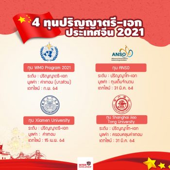 รวม 4 ทุนปริญญาตรี-เอก ประเทศจีน ปี 2021 EZ Webmaster January 31, 2021 สำหรับผู้ที่สนใจไปศึกษาต่อที่ประเทศจีน วันนี้เราได้รวบรวมทุนการศึกษาสำหรับการไปเรียนต่อในระดับปริญญาตรี-เอกที่ประเทศเอก ประจำปีการศึกษา 2021 ที่กำลังเปิดรับสมัครมาฝากกันค่ะ 1.ทุน WMO Program 2021 WMO Program 2021 โครงการทุนที่ตั้งขึ้นโดย World Meteorological Organization (WMO) MOE of China แก่นักศึกษาที่สำหรับการศึกษาวิจัยทางด้านอุตุนิยมวิทยา (meteorology) ในระดับปริญญาตรี ปริญญาโท และปริญญาเอก ที่ครอบคลุม ค่าเล่าเรียน ค่าที่พัก ค่าครองชีพและประกันสุขภาพ โดยรับสมัครถึงเดทไลน์ถึงกุมภาพันธ์หน้า รายละเอียดคลิก >>> http://th.interscholarship.com/somkiat2013/4358 2. ทุน ANSO ทุนองค์กร Alliance of International… Continue Reading