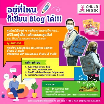 ศูนย์หนังสือจุฬาฯ จัดกิจกรรมเขียน Blog รีวิวหนังสือเตรียมสอบ tui sakrapee January 22, 2021 ศูนย์หนังสือจุฬาฯ ขอเชิญร่วมกิจกรรมรีวิวหนังสือเตรียมสอบผ่าน Blog ใน www.chulabook.com ชิงรางวัลกระเป๋าเป้ รุ่น Limited edition 3 รางวัล และบัตรสมาชิก VIP Chulabook ส่วนลด 10 % 3 รางวัล โดยมีกติการ่วมสนุกง่ายๆ ดังนี้ สมัครเป็นนักเขียนใน Blog ผ่านChulabook.com เขียนรีวิวหนังสือเตรียมสอบ (ได้ทุกประเภท) ไม่ว่าจะเป็นสอบ GAT, โทอิค, ก.พ., สอบเข้าม.ปลาย, สอบเข้าม.ต้น, สอบเข้าทำงาน เป็นต้น เลือกหนังสือที่เราอ่านเพื่อเตรียมสอบมาเขียนรีวิวความน่าสนใจของหนังสือเล่มนั้นๆ แบ่งปันให้ทุกคนได้อ่านในบล็อก จับรางวัลโดยการสุ่มรายชื่อ จำนวน 6 รางวัล ผู้สนใจร่วมกิจกรรมได้ตั้งแต่บัดนี้ จนถึงวันที่ 14… Continue Reading