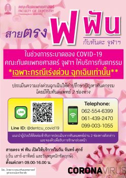 tui sakrapee January 7, 2021 บริการ “สายตรง ฟ ฟัน” คณะทันตแพทยศาสตร์ จุฬาฯ ให้คำปรึกษาปัญหาทางทันตกรรม ในช่วงการระบาดของ COVID-19 tui sakrapee January 7, 2021 คณะทันตแพทยศาสตร์ จุฬาฯ เปิดให้บริการ “สายตรง ฟ ฟัน กับทันตะ จุฬาฯ” ในช่วงการระบาดของ COVID-19 เพื่อประเมินความเร่งด่วนฉุกเฉิน ให้คำแนะนำปรึกษาปัญหาทางทันตกรรม ผ่านสองช่องทางคือ Line : @dentcu_covid19 และทางโทรศัพท์ 062-554-6399, 061-439-2470, 099-003-1055 ในวันจันทร์ –ศุกร์ เวลา 09.00 – 16.00 น. ทั้งนี้ คณะทันตแพทยศาสตร์ จุฬาฯ จะให้บริการทันตกรรมเฉพาะกรณีเร่งด่วน… Continue Reading